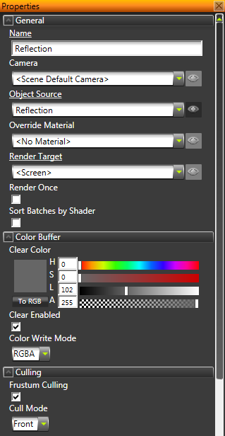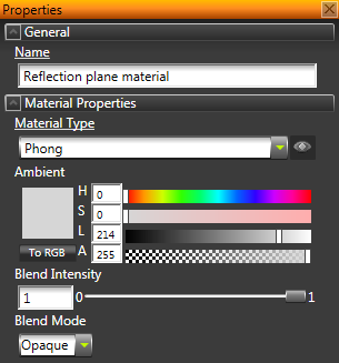 - (Optional) In the Library > Materials and Textures > Materials select the material you use for the reflection plane, and in the Properties adjust the material properties until you get the reflection plane you want.