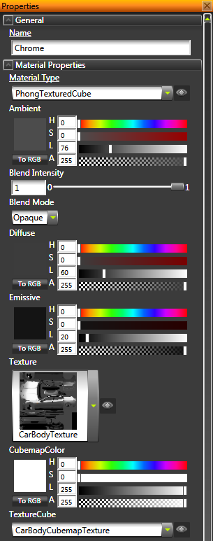 - In the Properties adjust the color properties to get the chrome reflection, for example, set: