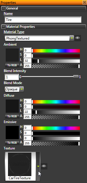 - In the Library select Materials and Textures > Materials > Tire, and in the Properties set:
