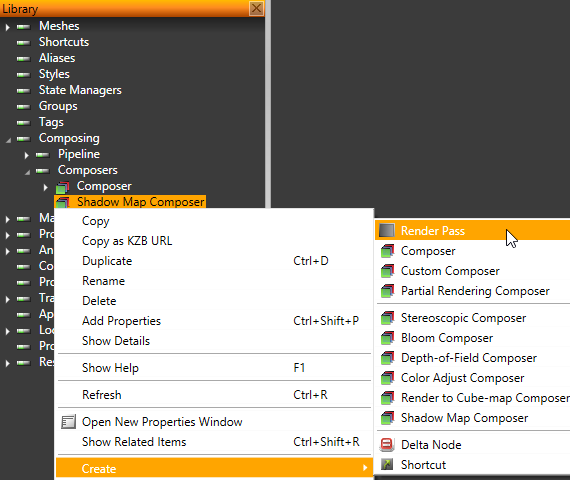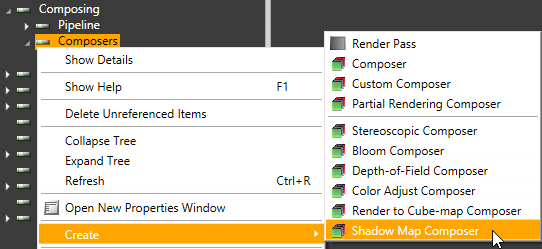 - In the Library right-click Composing > Composers and select Create > Shadow Map Composer.