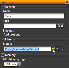 - In the Project select the object that receives shadows, and in the Properties set the Material property to PhongShadowMapMaterial.
