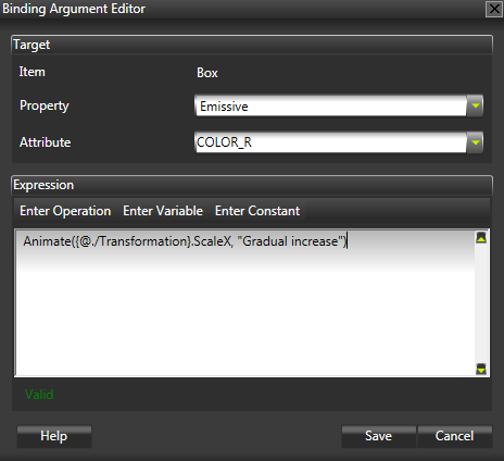 - Property and Attribute to the property and attribute you want to animate with the expression in the binding. Note that you can animate only a single attribute. For example, you can animate Color R attribute of Emissive Color attribute, not the Whole property attribute.