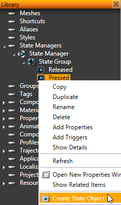 - In the Library right-click the state that defines the button when it is pressed, select Create State Object, and in the Properties set: