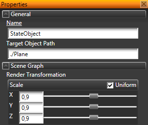 For example, to set the target to the Plane inside the Button, set the Target Object Path to ./Plane. - Click Add Properties, add Render Transformation property, and change the size or position of the object you want to associate with the state when the button is pressed.