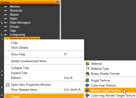 1. In the Library right-click Materials and Textures and select Create > Render Target Texture.