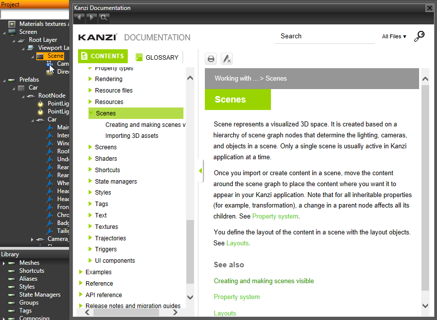 To find out still more, click any object or resource in Kanzi Studio and press F1. This opens the Kanzi documentation in a new Kanzi Studio dockable window or in your default web browser, depending on your settings.