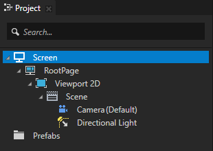 You create the structure of your Kanzi application in the Project window. The Project window contains two top-level items: