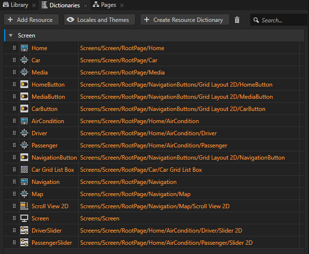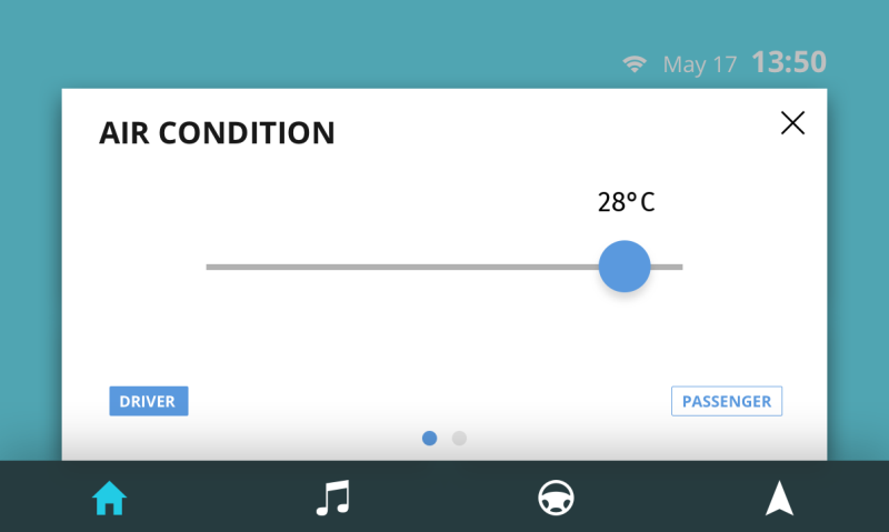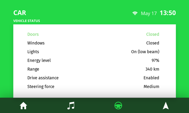 To try this out in the Kanzi Studio Preview, click the Preview window to set the focus to the window and press the Right Arrow key on your keyboard to navigate between the Home, Media, Car, and application screens. When each of the Page nodes is activated, the Toggle State of the Toggle Button which navigates to that Page is set to 1.