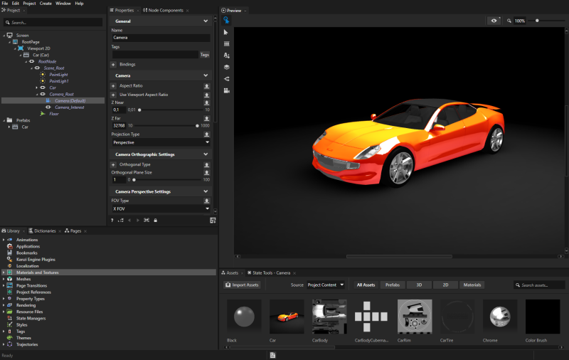 In this section you create a Scroll View node and connect it to the camera that shows the model you want to rotate. After opening the starting point project you first create a Scroll View 2D node which you use to control the rotation of the model, then you bind the Render Transformation property of the camera that shows the car model to the Scroll Position property in the Scroll View 2D node to rotate the car model.