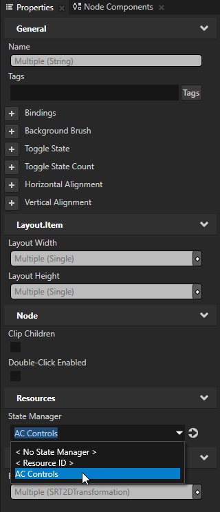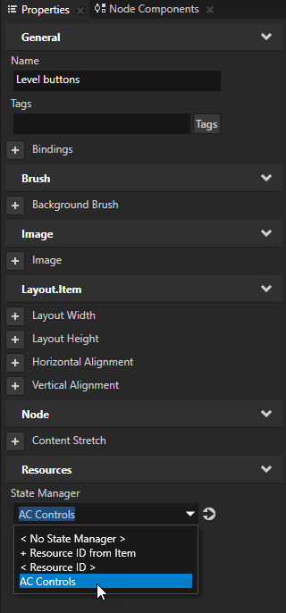 - In the Library > State Managers > AC Controls select the Level state group, and in the Properties set the Controller Property to Statemanagers.Level.