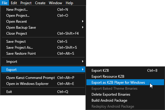 - In Kanzi Studio select > Export > Export as KZB Player for Windows and open the .exe file of the application in the <ProjectName>/Tool_project/Application Player directory.
