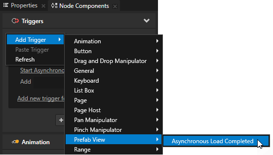 - In the Project select the Prefab View node, in the Node Components > Triggers section right-click and select Add Trigger > Prefab View > Asynchronous Load Completed.