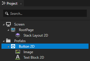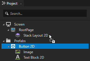 When you drop a node into Prefabs, Kanzi Studio creates a prefab template from the node and replaces the original node with an instance of the prefab.
