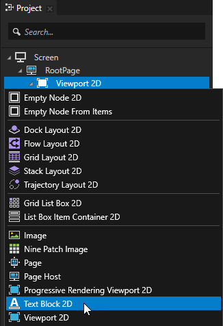 For example, in the Project window press Alt and right-click the Viewport 2D node and create a Text Block 2D node.
