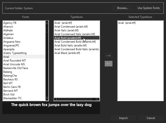When you open the Import Fonts window, Kanzi Studio shows system fonts. To import fonts from a different location, click Browse and select the directory from which you want to import fonts.