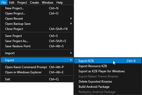 To create a kzb file from a Kanzi Studio project, open your Kanzi Studio project and select > Export > Export KZB.