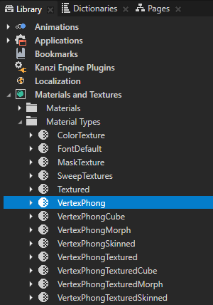 Lights contain properties that are passed as uniforms to shaders when Kanzi renders 3D nodes. Lights affect only the rendering of nodes which use materials with shaders that use those lights. In Kanzi the Phong material types by default support one directional light, two point lights, and one spot light. See Setting the number of lights for a material type.