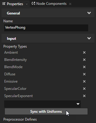 4. Add the property to the shader code and save the shader. You can use code snippets to declare a uniform by clicking the Uniforms button in the Shader Source Editor. See Editing shaders.