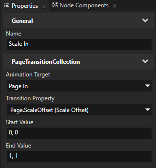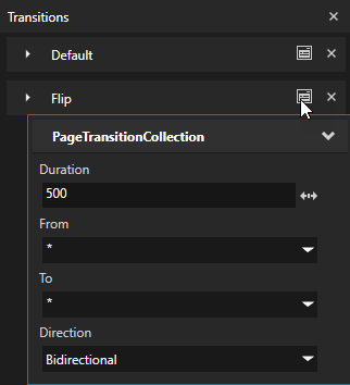 - To set a Page or Page Host to use the transition animation you created, in the Project select that Page or Page Host node, and in the Properties set the Transitions property to the transition which uses the animation.