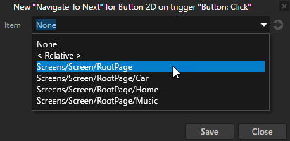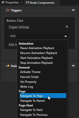 - In the Project select the control you created in the previous step, in the Node Components > Triggers section in the trigger type you want to use for the navigation click the dropdown menu, and select an action: