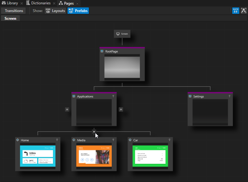 Use the Page nodes to create the structure of the user interface in your application, and the Page Host nodes to manage navigation requests and transitions between Page nodes under a Page Host node. For example, you can use Page and Page Host nodes to create different parts of the user interface in your Kanzi application, such as Page Host nodes Home, Media, , or Settings screens, each having their own hierarchy of Page and Page Host nodes.