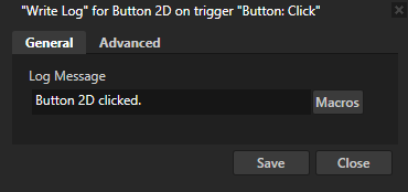 // Create the Write Log action in the Button: Click trigger in the current node (Button 2D node).