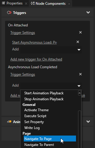 - In the Node Components > Triggers in the Asynchronous Load Completed trigger click the dropdown menu and select an action.