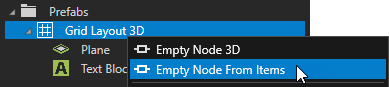 Replace the root node of a prefab when you want to add or change the node that is used as the parent node of a prefab. For example, if you first created a prefab that has a Grid Layout 3D as its root, but now you to place that Grid Layout 3D into a Stack Layout 3D, you need to replace the root node of that prefab.