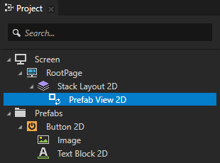 For example, if you use a Prefab View 2D node to instantiate a prefab which contains a Button 2D node, when Kanzi instantiates the prefab, it adds the root node of the Button 2D node as a child node of the Prefab View 2D node.