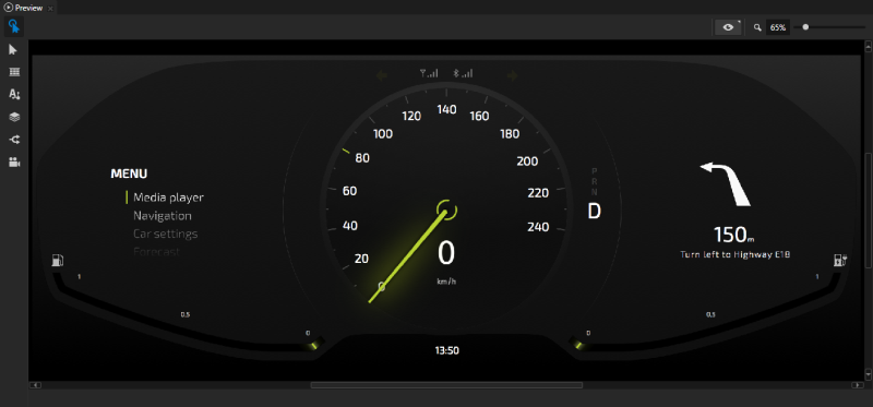 The Preview window in Kanzi Studio shows in real-time the currently open Kanzi application. For example, the Preview in this image shows the Kanzi application you can create by completing the Tutorial: Create gauges.