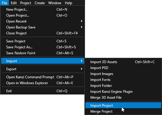 When you import a Kanzi Studio project, Kanzi Studio copies all content from the project you are importing (source project) to the current project (target project). Kanzi Studio replaces all items in the same location with the same name in both projects with the items from the source project.