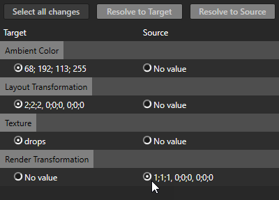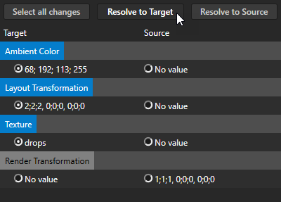 6. Resolve conflicts. When your target and source both contain the same item and properties of this item differ, you have to decide which properties you want to keep: