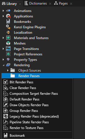 To create a render pass, in the Library > Rendering press Alt and right-click Render Passes and select the render pass you want to create.