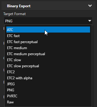 The format you select is important because this influences the size of the kzb file and the loading time when your Kanzi application needs the resource. Make sure that your target device supports the target format you select for the image. See Images and textures best practices.