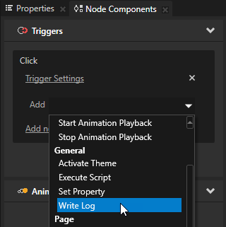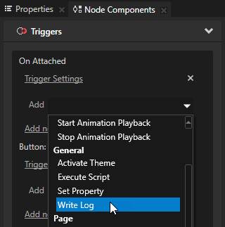 In a similar way you can add actions to print to the Log window (Write Log), set a property to a certain value (Set Property), navigate to a Page node (Navigate to Page), or change application theme (Activate Theme). See Adding a trigger and Removing a trigger.