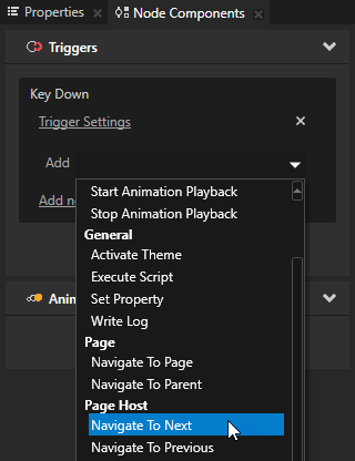 - Select the Screen node and in the Node Components > Triggers section add the Key Down trigger.