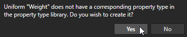 4. In the Create Property Type window click Yes to create the custom property type Weight you use to weigh between the Texture0 and Texture1 properties, in the Property Type Editor set the Default Value property to 0,5, and click Save.