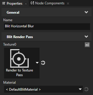 - In the Horizontal Blur render pass create a Blit Render Pass, name it Blit Horizontal Blur, and in the Properties set the Texture0 property to the Render to Texture Pass render pass.
