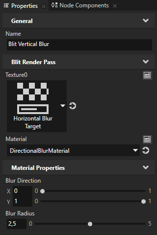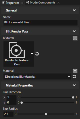 - In the Library select the Vertical Blur > Blit Horizontal Blur render pass and in the Properties set: