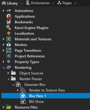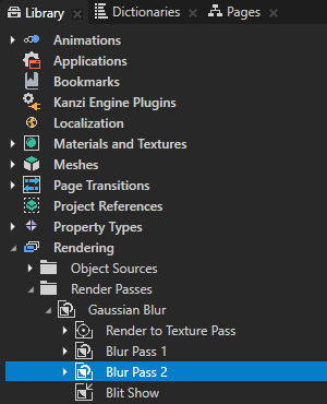 - In the Library duplicate the Blur Pass 1 render pass, rename it to Blur Pass 2, and drag it above the Blit Show render pass.