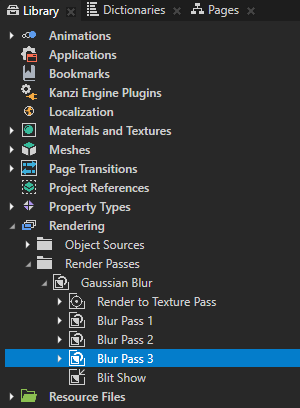 - In the Library duplicate the Blur Pass 2 render pass, rename it to Blur Pass 3, and drag it above the Blit Show render pass.