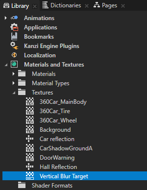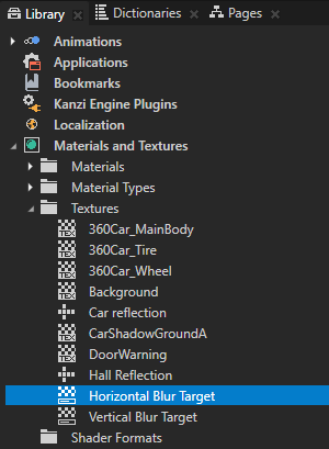 - In the Library > Materials and Textures > Textures select Vertical Blur Target, press the Ctrl D to duplicate the resource, press the F2 key, and rename the texture to Horizontal Blur Target.