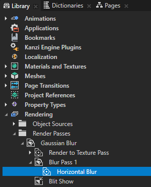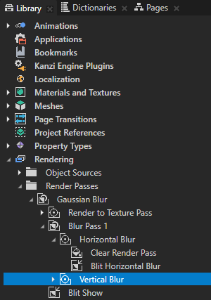 - In the Library > Rendering > Render Passes duplicate the Blur Pass 1 > Horizontal Blur render pass and rename it to Vertical Blur.