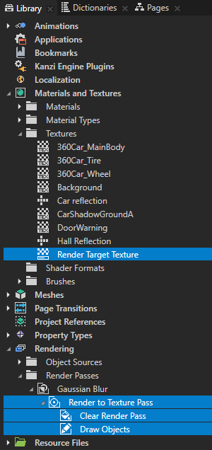 - In the Library select the Blur Pass 2 > Horizontal Blur > Blit Horizontal Blur render pass and in the Properties set the Texture0 property to the Vertical Blur Target texture.