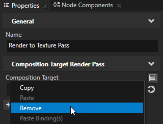 - In the Library select the Render to Texture Pass, in the Properties right-click the Composition Target property, and select Remove.