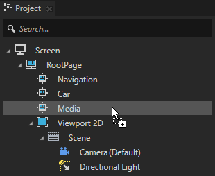 Viewport 2D is a special node because it can render both 2D objects, such as Image, Page, Button 2D, and a Scene, which is a 3D object. When you create a new Kanzi Studio project, the project has a Viewport 2D with a Scene that contains a Camera and a Directional Light.TIPWhen you press Alt and right-click a node in the Project window or a resource in the Library window, you get a direct access to the node and resource creation menu. If you only right-click a node or a resource, in the context menu select Create to access the creation menu.