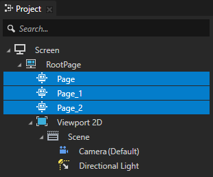 below the RootPage node to create a Page node. Create three Page child nodes in the RootPage node. As you add Page nodes in the Pages window, in the Project window Kanzi Studio shows the location of these nodes in the scene graph.