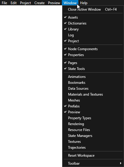 When you first create a project Kanzi Studio shows the most commonly used windows. You can find more specialized windows in the Window main menu. Arrange windows by moving them to the parts of the Kanzi Studio interface where you want to place them. In this tutorial you learn about the tools in the most common Kanzi Studio windows.