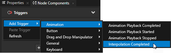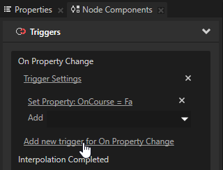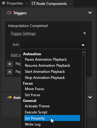 4. In the Node Components > Triggers section in the Interpolation Completed trigger click the Add dropdown menu, select the Set Property action, and in the action settings set: