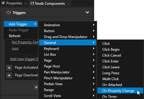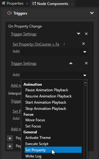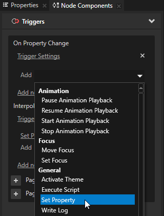 3. In the Node Components > Triggers section in the On Property Change trigger click the Add dropdown menu, select the Set Property action, and in the action settings set: